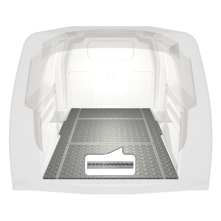 Onze lichte en robuuste vloeren met rails in de breedterichting zijn verkrijgbaar voor uiteenlopende modellen en zijn voorzien van een aluminiumplaat met antislip en ladingrails (in lengte- en breedterichting) voor het snel en veilig installeren van inrichtingssystemen en andere accessoires. De vloer wordt zonder boren met zeer sterke lijm gemonteerd. Dit is sterker dan moeren en bouten en zorgt dat de restwaarde van het voertuig behouden blijft.