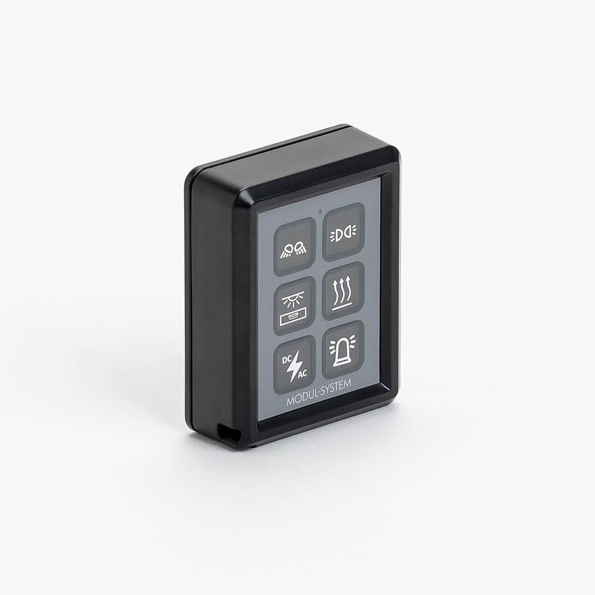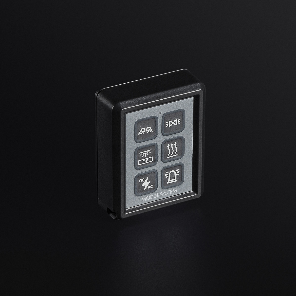 Het schakelpaneel wordt gevoed door lithiumbatterijen en bediend via Bluetooth®. Het is eenvoudig te installeren met behulp van de Bluetooth®-functie en kan in het voertuig gemonteerd worden met zelfklevende pads. Het schakelpaneel kan ook worden gebruikt als afstandsbediening met een werkbereik van maximaal 100 m.