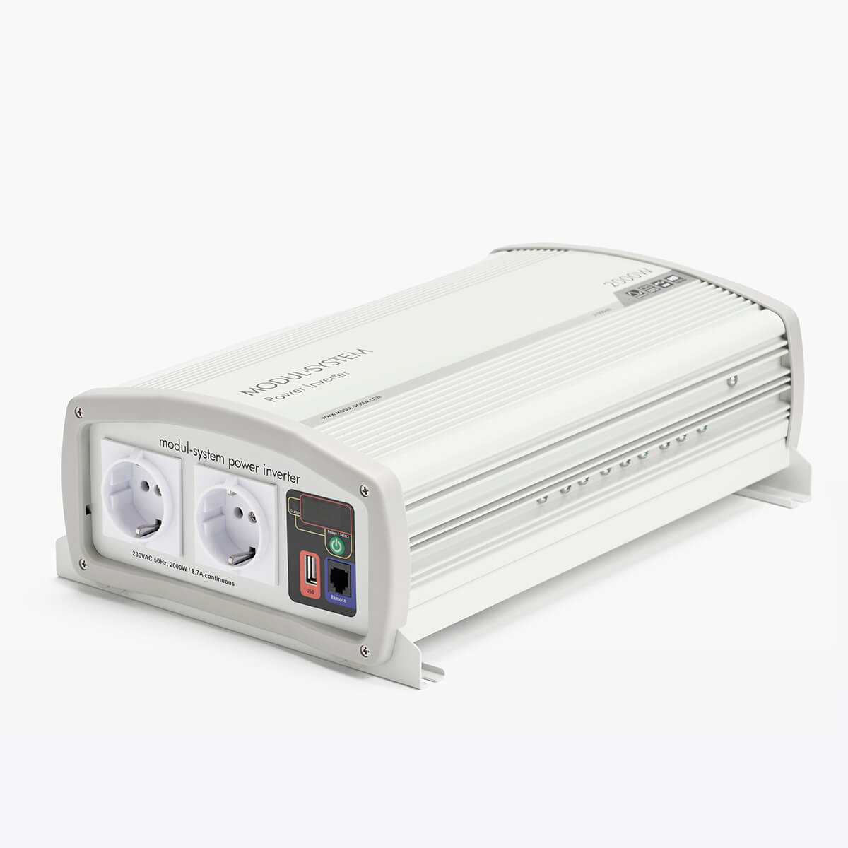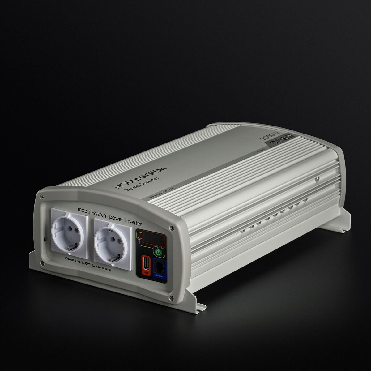 De omvormer heeft een scherm waarop de batterijstatus en laadmeting wordt weergegeven, een EU-stroomaansluiting en een usb-poort om usb-apparaten op te laden. Geïntegreerde bevestigingspunten en hoogwaardige gelijkstroomaansluitingen zorgen voor een eenvoudige installatie.