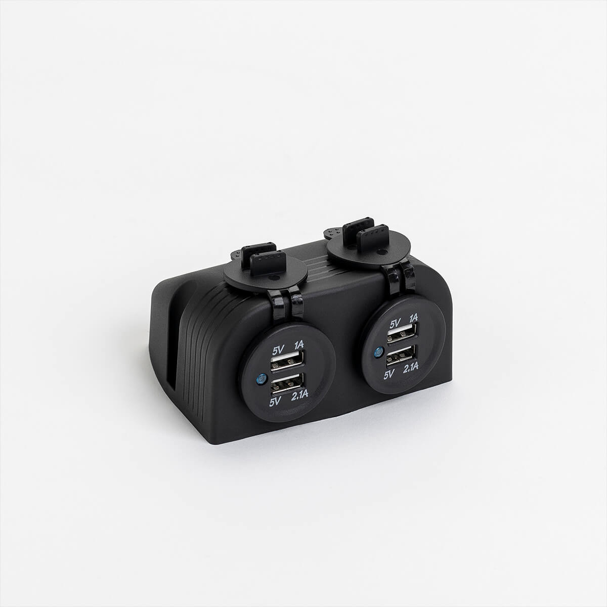 12V double power socket with surface mounted housing. Comprises of two USB sockets, each with double output (5V 1A/2.1A).