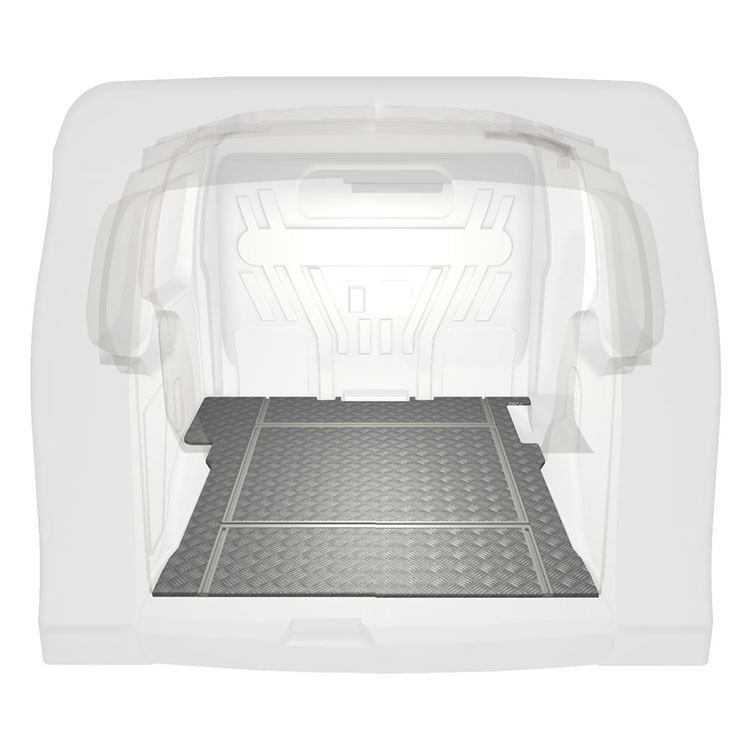 Lichtgewicht, robuuste bestelwagenvloer met dwarsrails voor een Ford Transit Connect met antislip-instaplijst van aluminium en cargorails (in de lengte en in de breedte) voor een snelle en veilige installatie van inrichtingssystemen en andere accessoires.