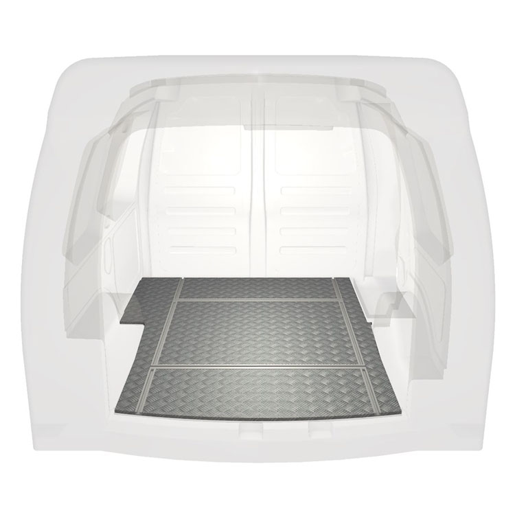 Lichtgewicht, robuuste bestelwagenvloer met dwarsrails voor een Volkswagen Caddy met antislip-instaplijst van aluminium en cargorails (in de lengte en in de breedte) voor een snelle en veilige installatie van inrichtingssystemen en andere accessoires.