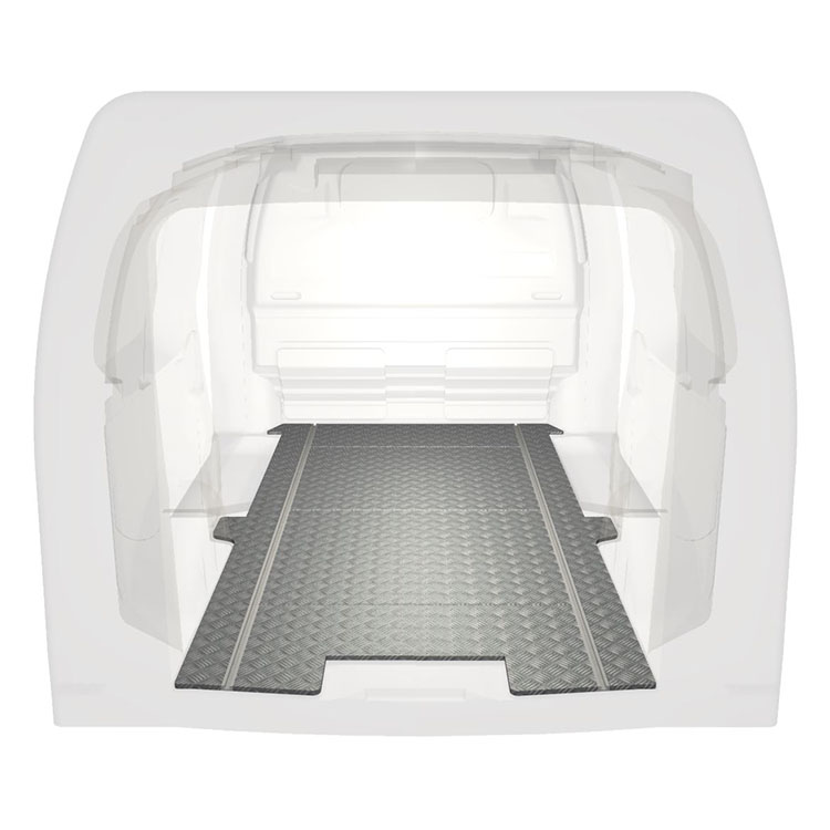 Lichtgewicht, robuuste standaard-bestelwagenvloer voor een Citroën Jumpy / Peugeot Expert / Toyota ProAce met antislip-instaplijst van aluminium en cargorails (in de lengte) voor een snelle en veilige installatie van inrichtingssystemen en andere accessoires.