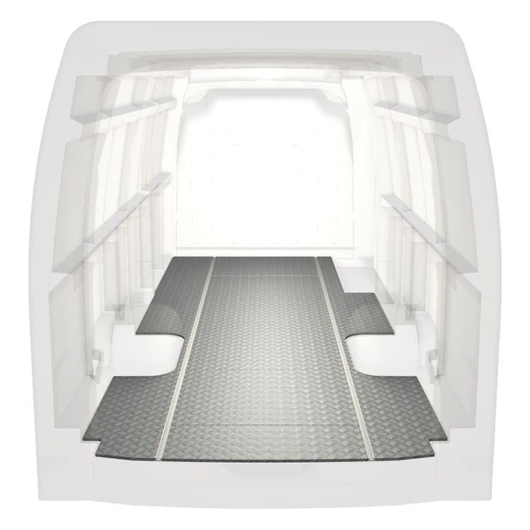 Lichtgewicht, robuuste standaard-bestelwagenvloer voor een Renault Master / Opel Movano / Nissan NV400 met antislip-instaplijst van aluminium en cargorails (in de lengte) voor een snelle en veilige installatie van inrichtingssystemen en andere accessoires.