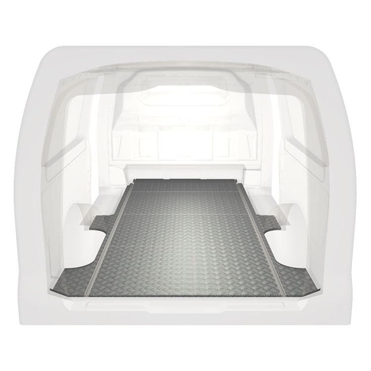 Lichtgewicht, robuuste standaard-bestelwagenvloer voor een Mercedes Vito met antislip-instaplijst van aluminium en cargorails (in de lengte) voor een snelle en veilige installatie van inrichtingssystemen en andere accessoires.