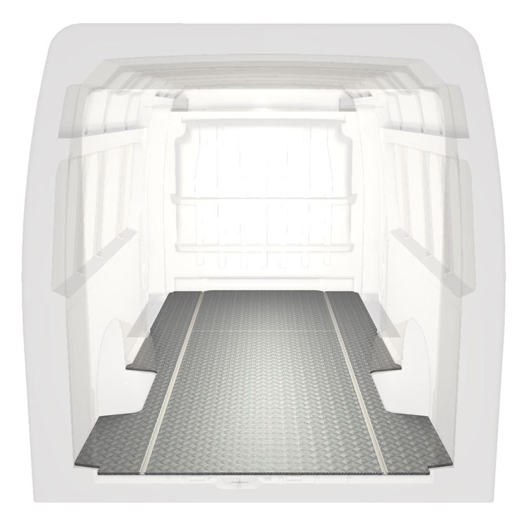 Lichtgewicht, robuuste extra lange vloer voor een Citroën Jumper / Peugeot Boxer / Fiat Ducato met antislip-instaplijst van aluminium en cargorails (in de lengte) voor een snelle en veilige installatie van inrichtingssystemen en andere accessoires.