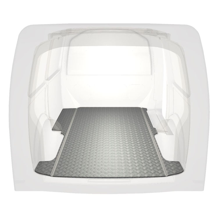 Lichtgewicht, robuuste extra lange vloer voor een Volkswagen Transporter T6 met antislip-instaplijst van aluminium en cargorails (in de lengte) voor een snelle en veilige installatie van inrichtingssystemen en andere accessoires.