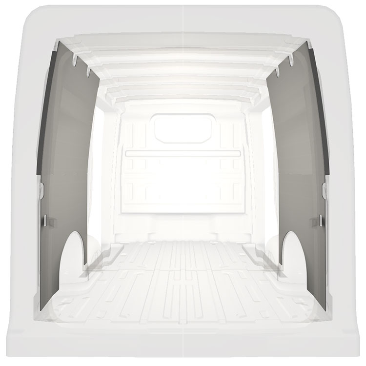 Lichtgewicht volledige bekleding voor de binnenwanden van een Volkswagen Crafter / MAN TGE met dubbele zijportieren. De bekleding zorgt voor een lichte, aangename werkomgeving en is makkelijk schoon te vegen.
