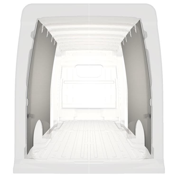 Lichtgewicht volledige bekleding voor de binnenwanden van een Volkswagen Crafter / MAN TGE met dubbele zijportieren. De bekleding zorgt voor een lichte, aangename werkomgeving en is makkelijk schoon te vegen.