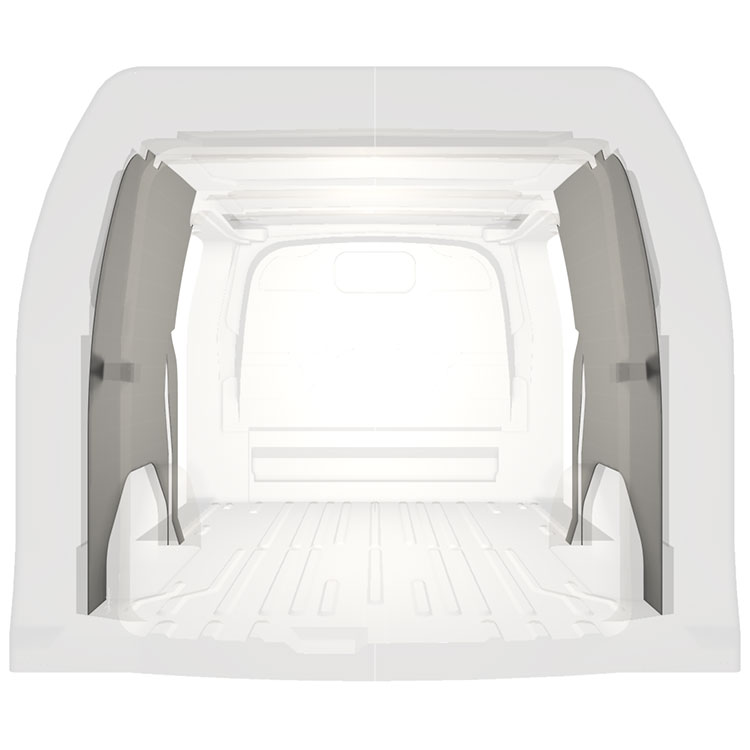 Lichtgewicht volledige bekleding voor de binnenwanden van een Ford Transit Custom met dubbele zijportieren. De bekleding zorgt voor een lichte, aangename werkomgeving en is makkelijk schoon te vegen.