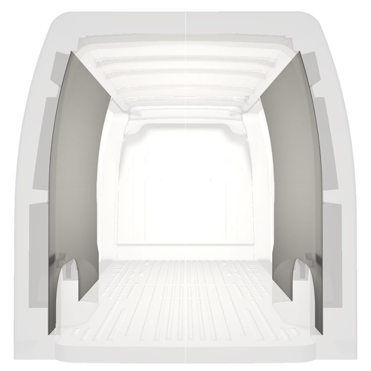 Lichtgewicht volledige bekleding voor de binnenwanden van een Renault Master / Opel Movano / Nissan NV400 met dubbele zijportieren. De bekleding zorgt voor een lichte, aangename werkomgeving en is makkelijk schoon te vegen.