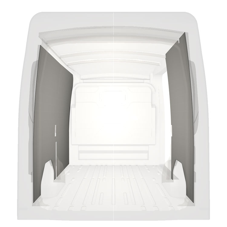 Lichtgewicht volledige bekleding voor de binnenwanden van een Ford Transit met een zijportier aan de rechterkant.De bekleding zorgt voor een lichte, aangename werkomgeving en is makkelijk schoon te vegen.