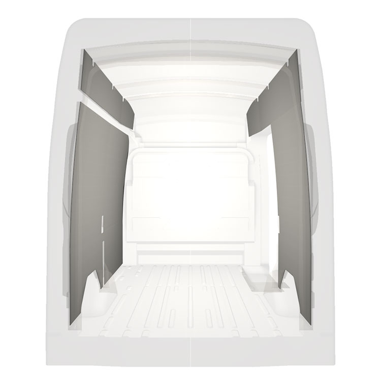 Lichtgewicht volledige bekleding voor de binnenwanden van een Ford Transit met een zijportier aan de rechterkant.De bekleding zorgt voor een lichte, aangename werkomgeving en is makkelijk schoon te vegen.
