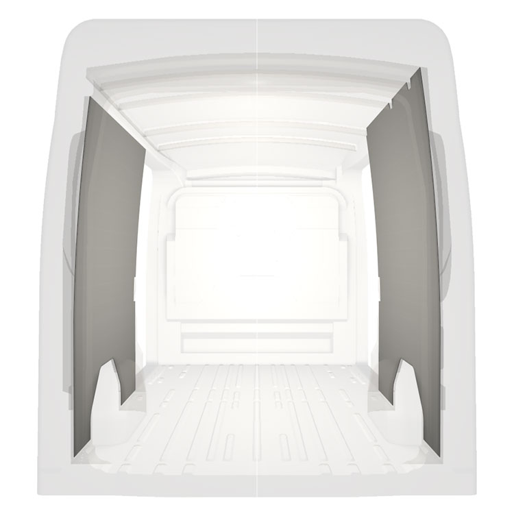 Lichtgewicht volledige bekleding voor de binnenwanden van een Ford Transit met dubbele zijportieren. De bekleding zorgt voor een lichte, aangename werkomgeving en is makkelijk schoon te vegen.