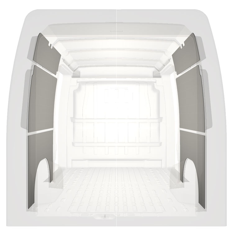 Lichtgewicht voorgesneden bekleding voor de binnenwanden van een Citroën Jumper / Peugeot Boxer / Fiat Ducato met dubbele zijportieren. De bekleding zorgt voor een lichte, aangename werkomgeving en is makkelijk schoon te vegen.