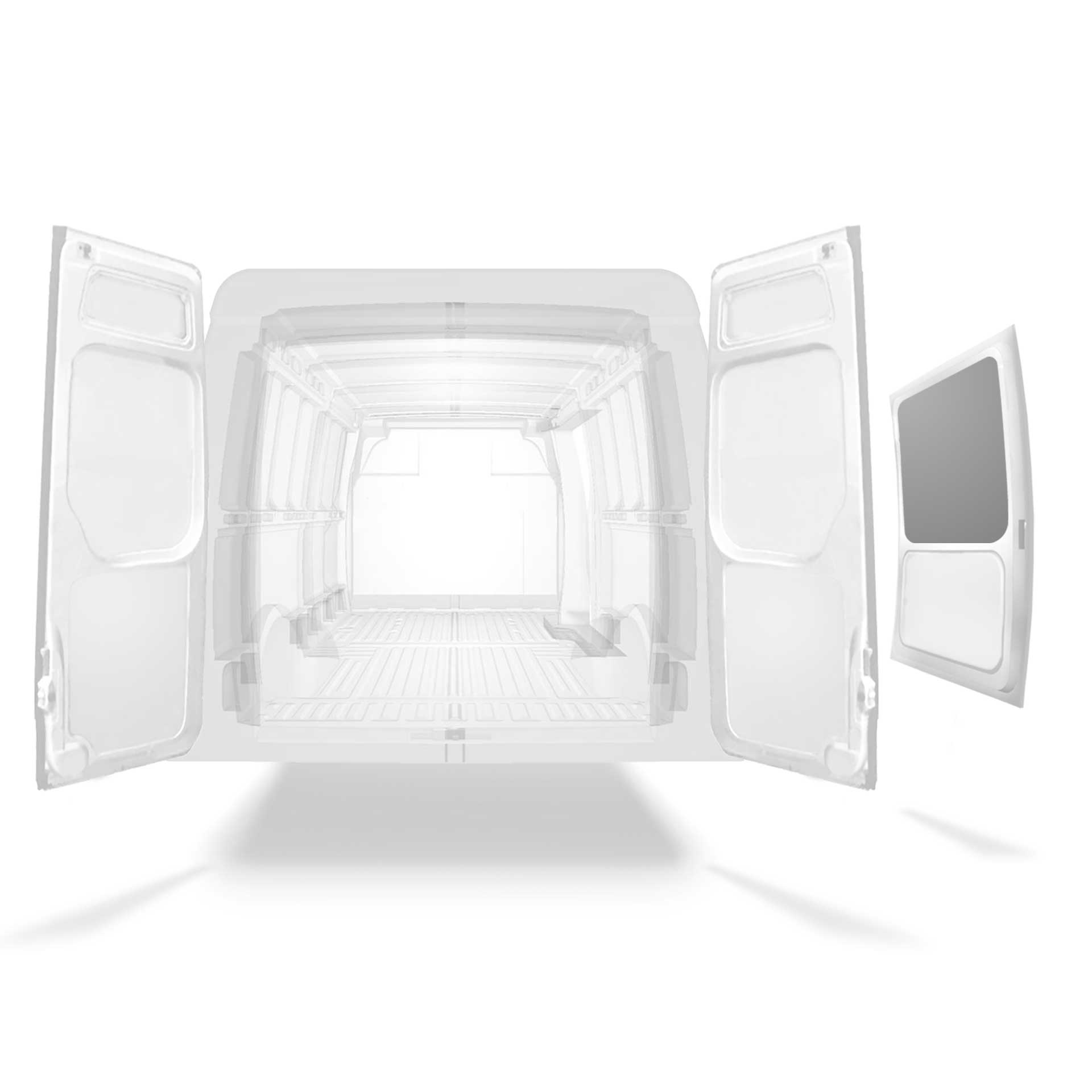 Lichtgewicht bekleding voor het bovenste gedeelte van het zijportier van een Iveco Daily met een zijportier aan de rechterkant. De bekleding vermindert slijtage van het interieur, en helpt de restwaarde van de bestelbus te behouden.