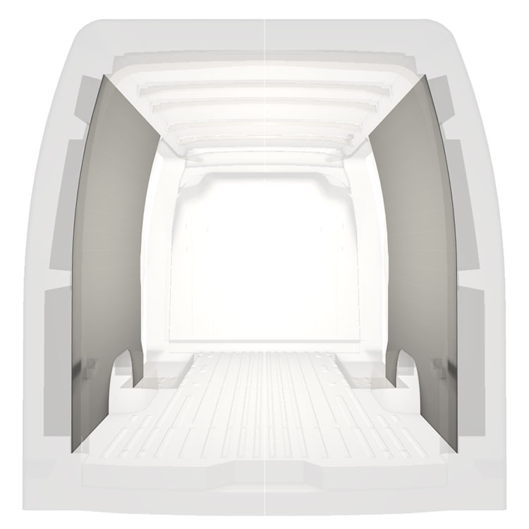 Lichtgewicht volledige bekleding voor de binnenwanden van een Renault Master / Opel Movano / Nissan NV400 met dubbele zijportieren. De bekleding zorgt voor een lichte, aangename werkomgeving en is makkelijk schoon te vegen.