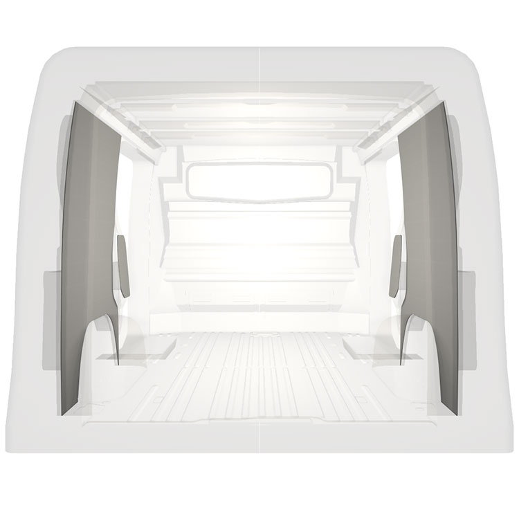 Lichtgewicht volledige bekleding voor de binnenwanden van een Renault Trafic / Opel Vivaro / Fiat Talento / Nissan NV300 met dubbele zijportieren. De bekleding zorgt voor een lichte, aangename werkomgeving en is makkelijk schoon te vegen.