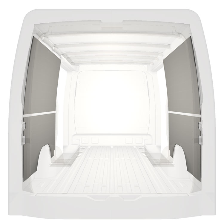 Lichtgewicht voorgesneden bekleding voor de binnenwanden van een Mercedes Sprinter met dubbele zijportieren. De bekleding zorgt voor een lichte, aangename werkomgeving en is makkelijk schoon te vegen.
