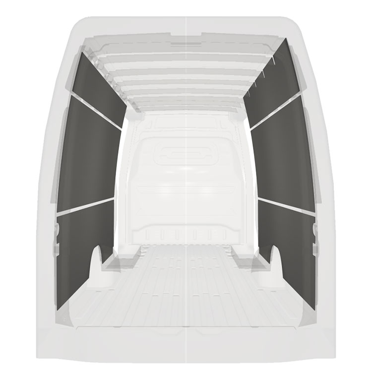 Lichtgewicht voorgesneden bekleding voor de binnenwanden van een Mercedes Sprinter met dubbele zijportieren. De bekleding zorgt voor een lichte, aangename werkomgeving en is makkelijk schoon te vegen.