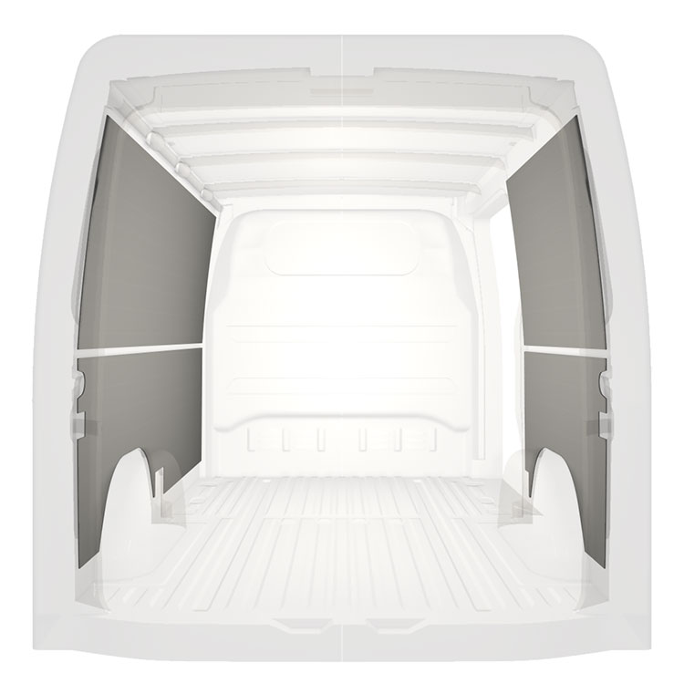 Lichtgewicht paneelbekleding voor de binnenwanden van een Mercedes Sprinter met zijportier aan de rechterkant. De bekleding zorgt voor een lichte, aangename werkomgeving en is makkelijk schoon te vegen.
