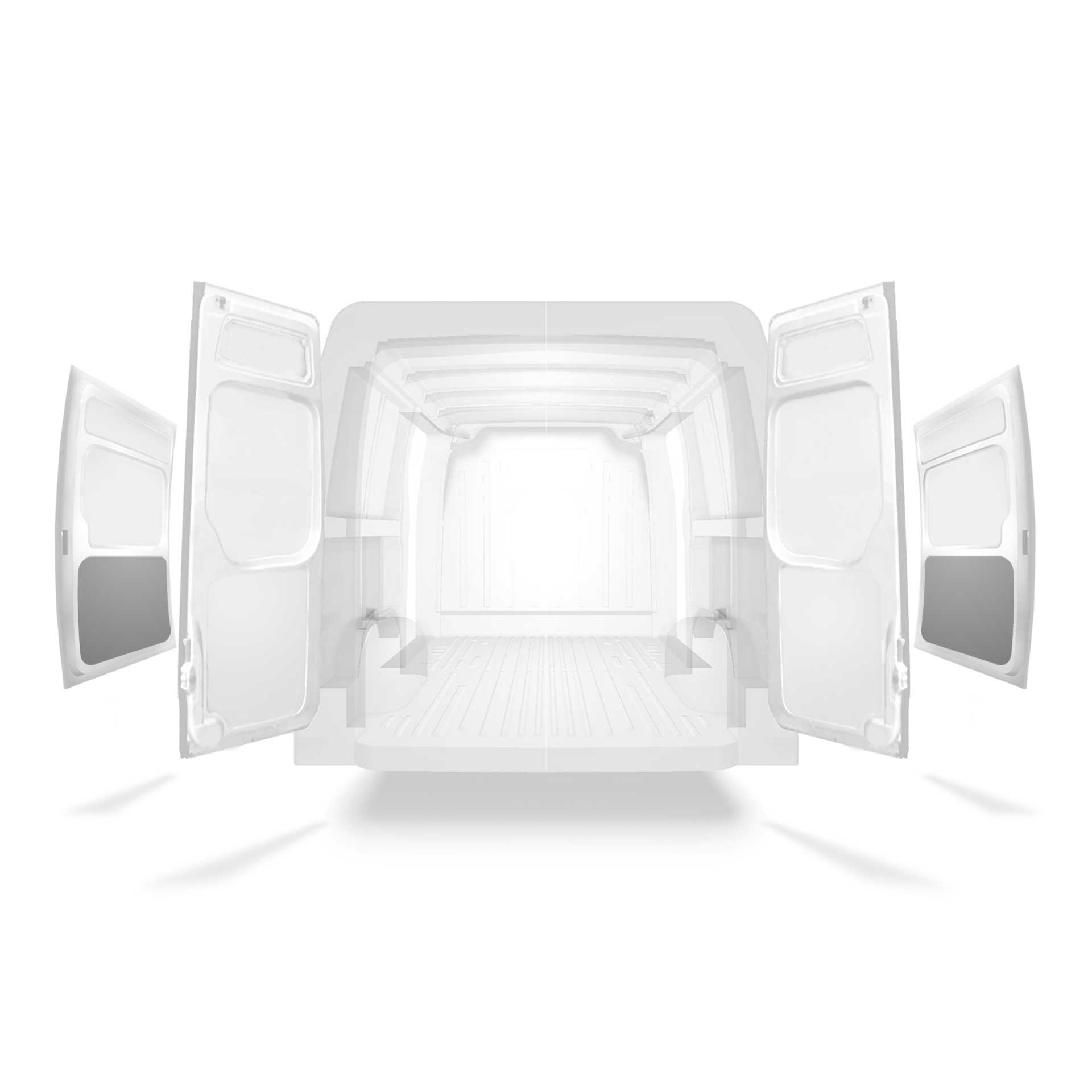 Lichtgewicht bekleding voor het onderste gedeelte van het zijdeur van een Renault Master / Opel Movano / Nissan NV400 met dubbele schuifdeuren. De bekleding vermindert slijtage van het interieur en helpt om de restwaarde van de bestelwagen te behouden.