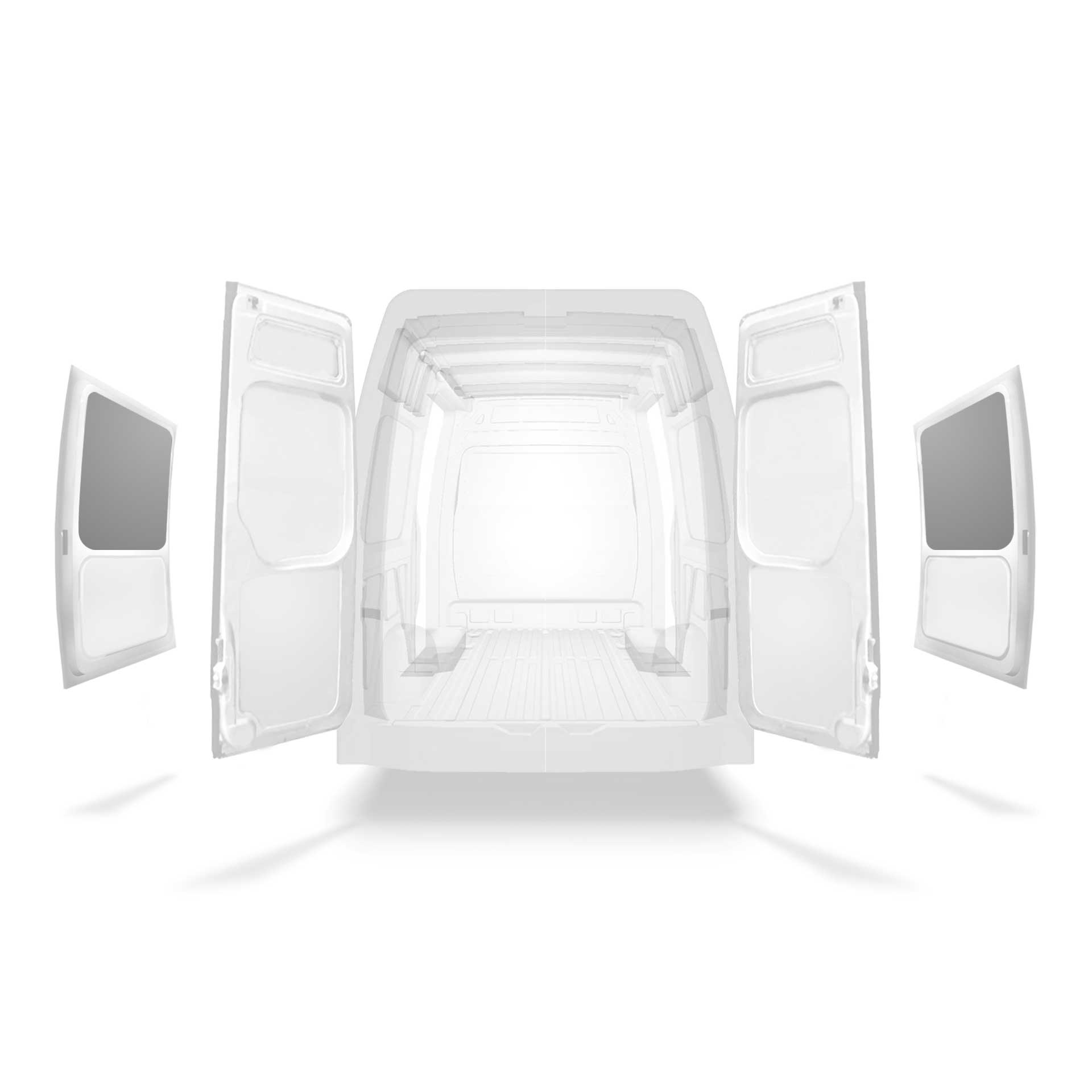 Lichtgewicht bekleding voor het bovenste gedeelte van het zijportier van een Mercedes Sprinter met dubbele zijportieren. De bekleding vermindert slijtage van het interieur, en helpt de restwaarde van de bestelbus te behouden.