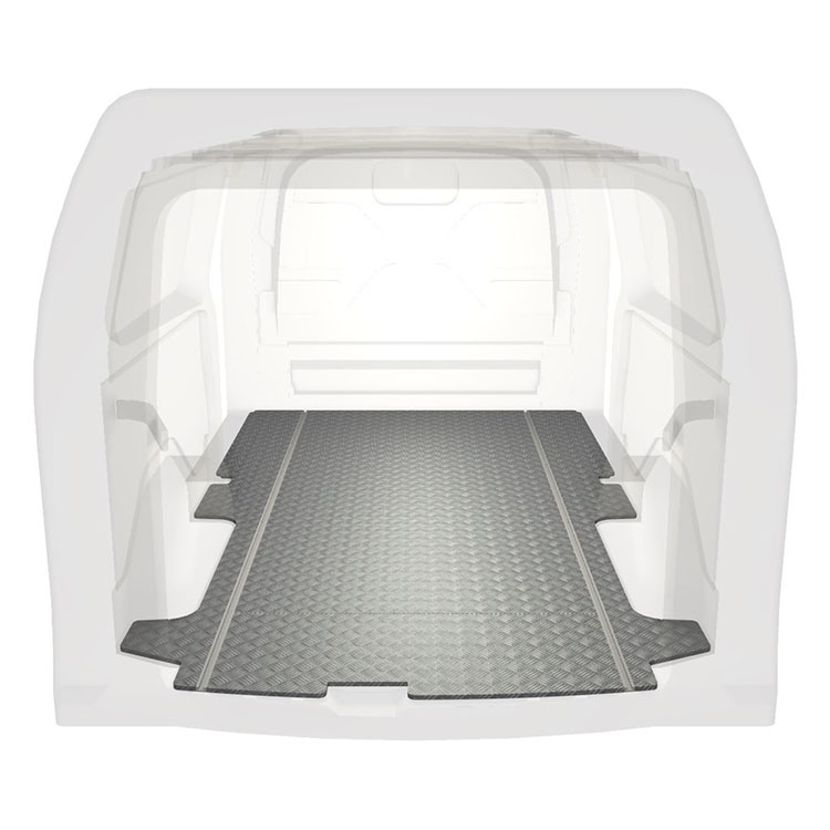 Lichtgewicht, robuuste standaard-bestelwagenvloer voor een Ford Transit Custom met antislip-instaplijst van aluminium en cargorails (in de lengte) voor een snelle en veilige installatie van inrichtingssystemen en andere accessoires.