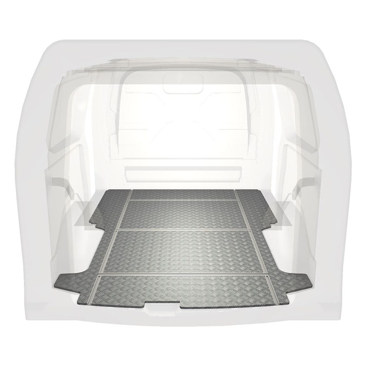 Lichtgewicht, robuuste bestelwagenvloer met dwarsrails voor een Ford Transit Custom met antislip-instaplijst van aluminium en cargorails (in de lengte en in de breedte) voor een snelle en veilige installatie van inrichtingssystemen en andere accessoires.