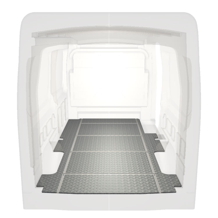 Lichtgewicht, robuuste bestelwagenvloer met dwarsrails voor een Ford Transit met antislip-instaplijst van aluminium en cargorails (in de lengte en in de breedte) voor een snelle en veilige installatie van inrichtingssystemen en andere accessoires.