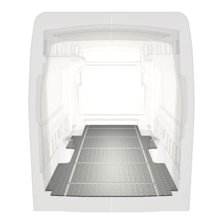 Lichtgewicht, robuuste bestelwagenvloer met dwarsrails voor een Ford Transit met antislip-instaplijst van aluminium en cargorails (in de lengte en in de breedte) voor een snelle en veilige installatie van inrichtingssystemen en andere accessoires.