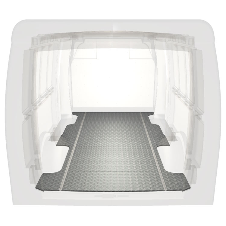Lichtgewicht, robuuste standaard-bestelwagenvloer voor een Iveco Daily met antislip-instaplijst van aluminium en cargorails (in de lengte) voor een snelle en veilige installatie van inrichtingssystemen en andere accessoires.