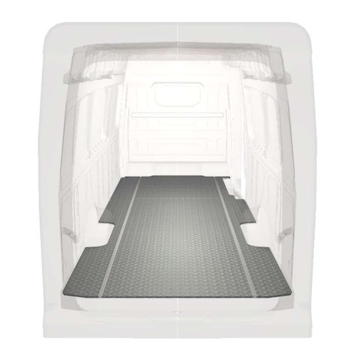 Lichtgewicht, robuuste standaard-bestelwagenvloer voor een Volkswagen Crafter / MAN TGE met antislip-instaplijst van aluminium en cargorails (in de lengte) voor een snelle en veilige installatie van inrichtingssystemen en andere accessoires.