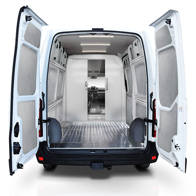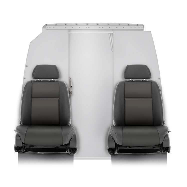 | The bulkhead, made from lightweight material, is equipped with a sliding door for quick and easy access to the cargo area from the cabin. The door is centered to create maximal space between the driver and passenger seat, making loading and unloading easier and more efficient. This bulkhead comes with a cylinder-lock and an extra high door which requires a high cabin roof or modification of low cabin roof. The bulkhead is pre-assembled in the Modul-System factory, which allows for quick and easy installation in the vehicle. Door height: 1703 mm Installation time: 1 hour |