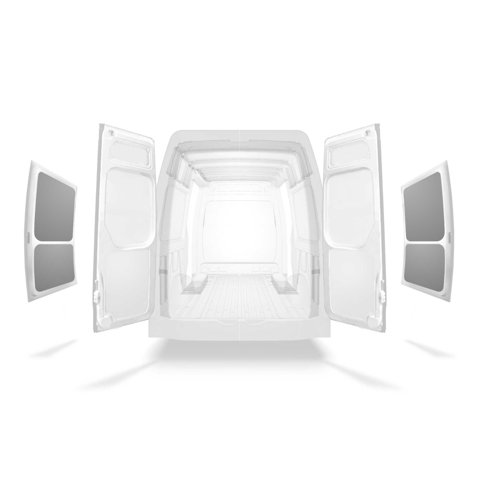 Deze lichtgewicht zijdeurpaneelbekleding is voor een Mercedes Sprinter met dubbele schuifdeur. Alle gebruikte materialen van de paneelbekleding zijn gemakkelijk schoon te vegen en zorgen voor een lichte werkomgeving.