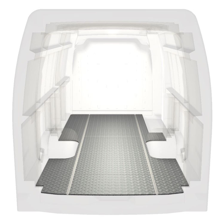 Lichtgewicht, robuuste standaard-bestelwagenvloer voor een Renault Master / Opel Movano / Nissan NV400 met antislip-instaplijst van aluminium en cargorails (in de lengte) voor een snelle en veilige installatie van inrichtingssystemen en andere accessoires.