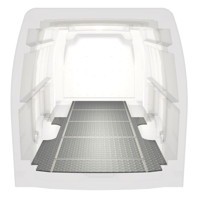 Lichtgewicht, robuuste bestelwagenvloer met dwarsrails voor een Renault Master / Opel Movano / Nissan NV400 met antislip-instaplijst van aluminium en cargorails (in de lengte en in de breedte) voor een snelle en veilige installatie van inrichtingssystemen en andere accessoires.