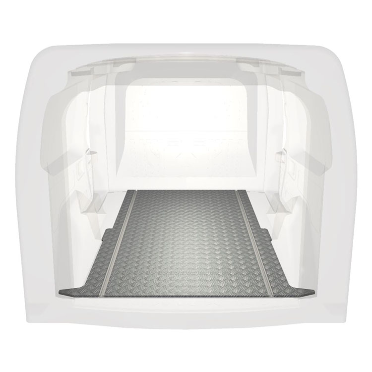 Lichtgewicht, robuuste extra lange vloer voor een Opel Combo / Fiat Doblò met antislip-instaplijst van aluminium en cargorails (in de lengte) voor een snelle en veilige installatie van inrichtingssystemen en andere accessoires.