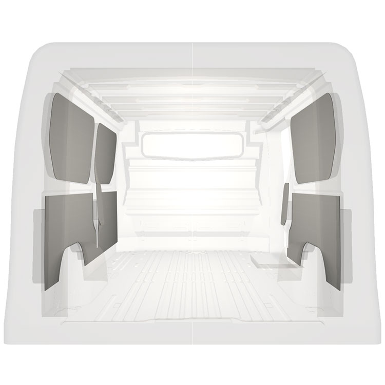 Lichtgewicht paneelbekleding voor de binnenwanden van een Renault Trafic / Opel Vivaro / Fiat Talento / Nissan NV300 met zijportier aan de rechterkant. De bekleding zorgt voor een lichte, aangename werkomgeving en is makkelijk schoon te vegen.