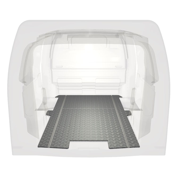 Lichtgewicht, robuuste standaard-bestelwagenvloer voor een Citroën Jumpy / Peugeot Expert / Toyota ProAce met antislip-instaplijst van aluminium en cargorails (in de lengte) voor een snelle en veilige installatie van inrichtingssystemen en andere accessoires.