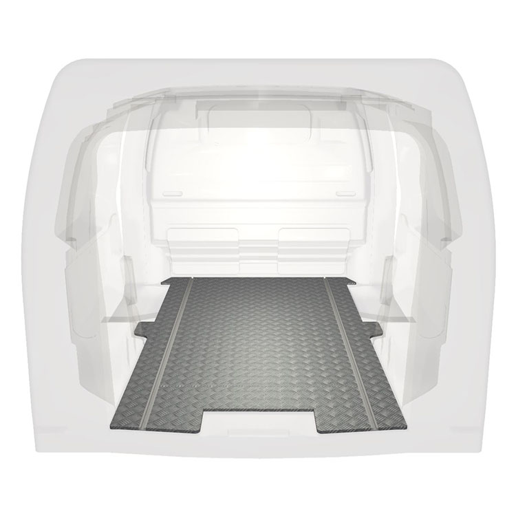 Lichtgewicht, robuuste extra lange vloer voor een Citroën Jumpy / Peugeot Expert / Toyota ProAce met antislip-instaplijst van aluminium en cargorails (in de lengte) voor een snelle en veilige installatie van inrichtingssystemen en andere accessoires.