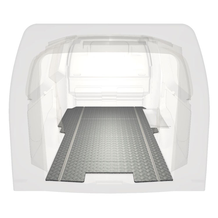 Lichtgewicht, robuuste standaard-bestelwagenvloer voor een Citroën Jumpy / Peugeot Expert / Toyota ProAce met antislip-instaplijst van aluminium en cargorails (in de lengte) voor een snelle en veilige installatie van inrichtingssystemen en andere accessoires.