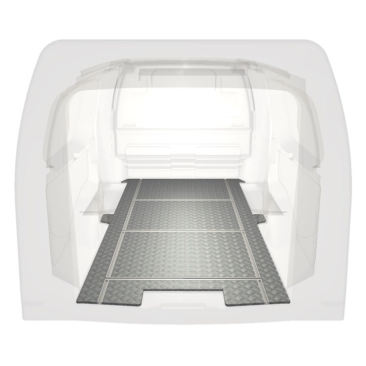 Lichtgewicht, robuuste bestelwagenvloer met dwarsrails voor een Citroën Jumpy / Peugeot Expert / Toyota ProAce met antislip-instaplijst van aluminium en cargorails (in de lengte en in de breedte) voor een snelle en veilige installatie van inrichtingssystemen en andere accessoires.