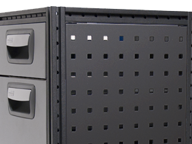 In de openingen kunnen accessoires zoals afvalmanden en formulierhouders worden bevestigd. Met behulp van gereedschapshouders wordt zo uw gereedschap flexibel en toegankelijk opgeborgen. De gereedschapspanelen worden bevestigd met clips.