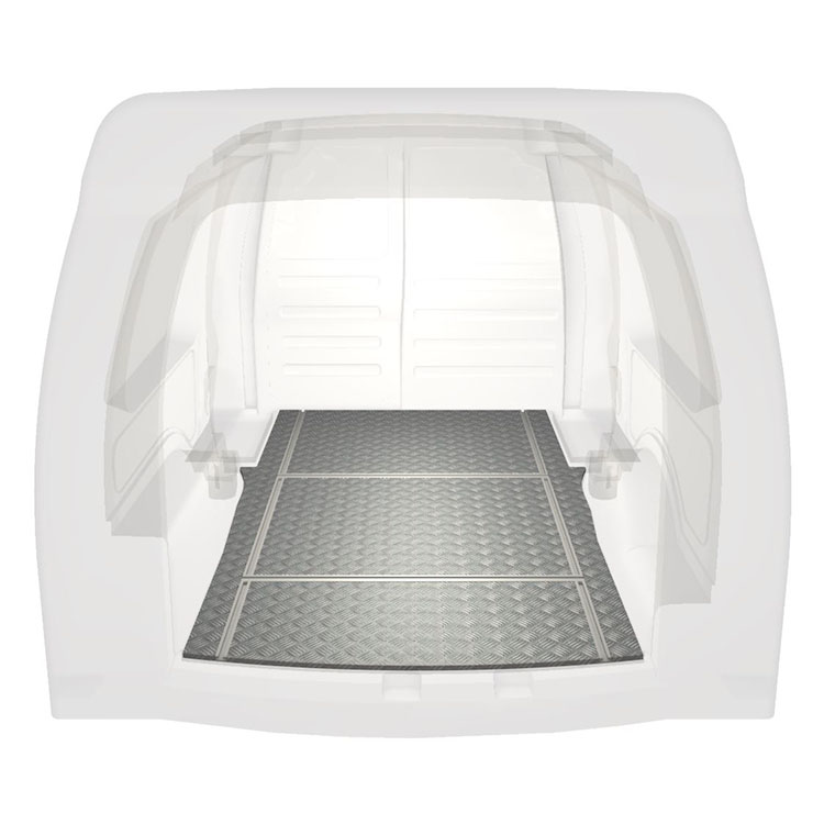 Lichtgewicht, robuuste bestelwagenvloer met dwarsrails voor een Volkswagen Caddy Maxi met antislip-instaplijst van aluminium en cargorails (in de lengte en in de breedte) voor een snelle en veilige installatie van inrichtingssystemen en andere accessoires.