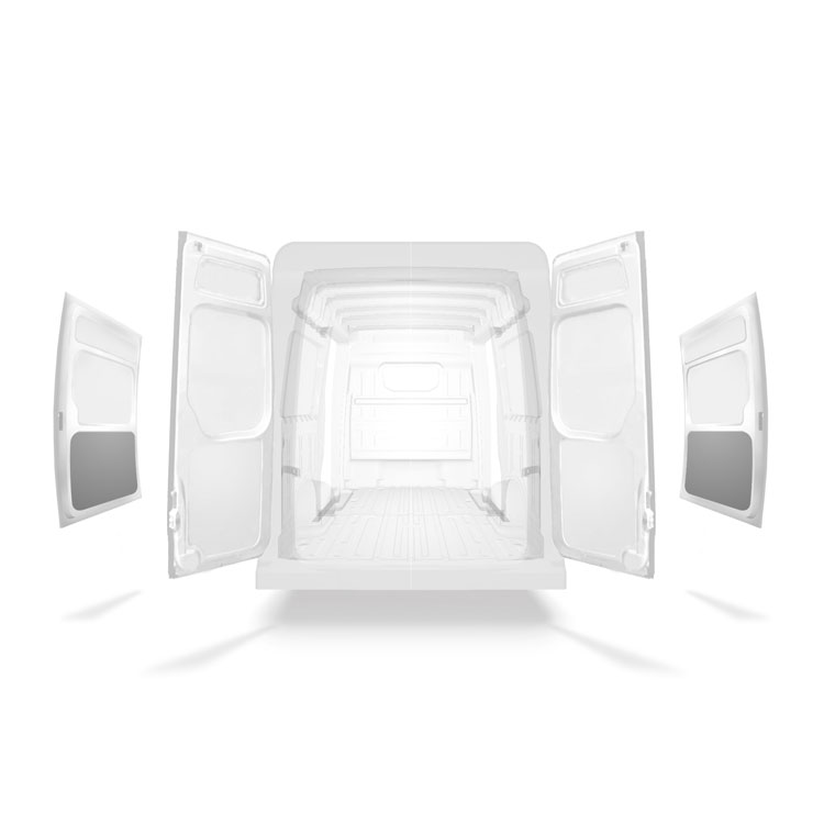 Lichtgewicht bekleding voor het onderste gedeelte van het zijdeur van een Volkswagen Transporter T6 Volkswagen Crafter / MAN TGE met dubbele schuifdeuren. De bekleding vermindert slijtage van het interieur en helpt om de restwaarde van de bestelwagen te behouden.